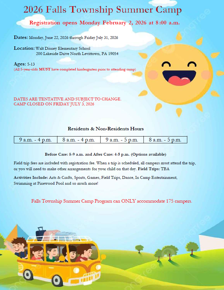If you experiencing any problems registering for the summer camp program, please contact Erin Long at e.long@fallstwp.com or (215) 949-9018; Barbara Loessy at b.loessy@fallstwp.com or (215) 949-9004.
