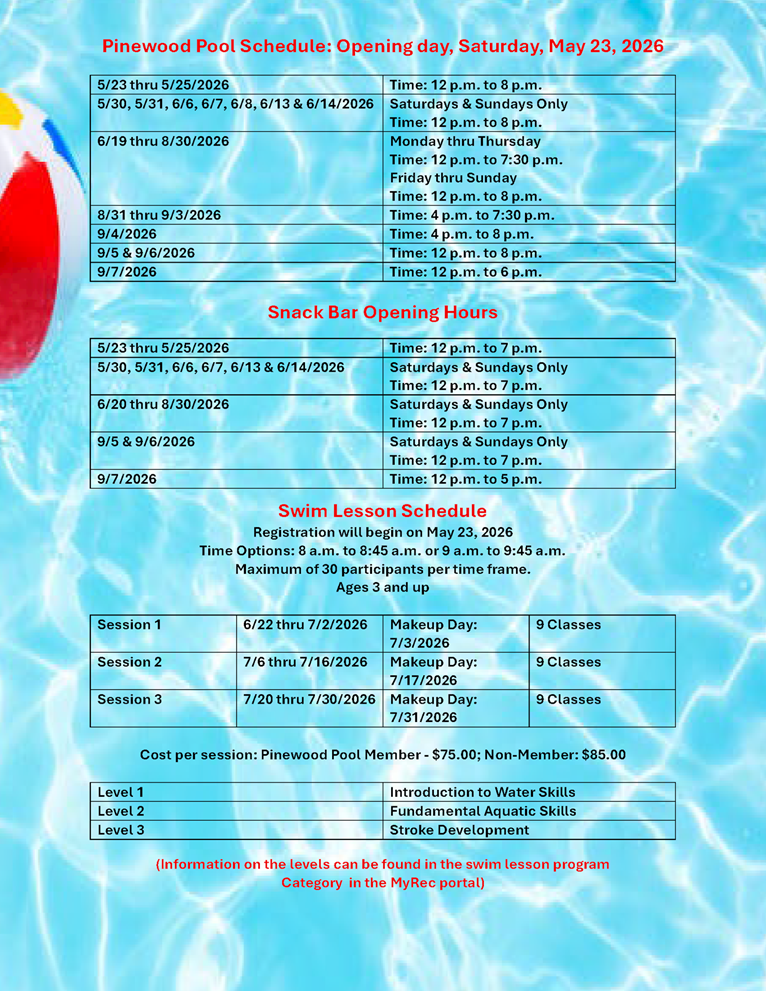 Registrations will be completed using MyRec. You will first create an account, if you do not already have one. Once you create your account, register for the Pinewood Pool membership, swim lessons and various other activities.