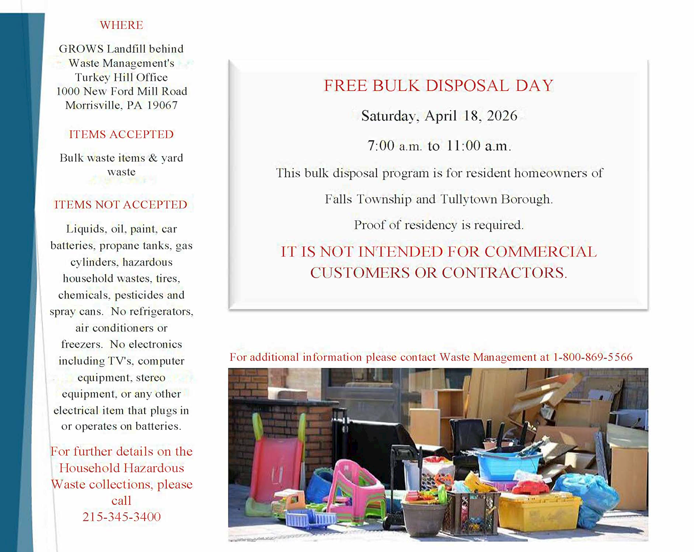 Home Information Trash & Recycling2025 Spring Yard Waste Cleanup - Saturday, April 19, 2025Free Bulk Disposal Day - Saturday, April 18, 2026Household Hazardous Waste Collection Events2025 Leaf Collection Schedule2026 Christmas Tree PickupElectronic Disposal Options Free Bulk Disposal Day - Saturday, April 18, 2026 Information Contact & Directory Employment Opportunities Fire Companies History of Falls Township Three Arches Pennsbury Manor Historic Fallsington Libraries Live Here, Spend Here Campaign Businesses Logo Contest Winner Mitigation and Recovery Information Municipal Access TV Municipal Building Renovation Project 2023 Renovations 2024 Renovations 2025 Renovations PECO Related Information Right to Know (Open Records) Schools Stormwater Management Township Newsletter Trash & Recycling 2025 Spring Yard Waste Cleanup - Saturday, April 19, 2025 Free Bulk Disposal Day - Saturday, April 18, 2026 Household Hazardous Waste Collection Events 2025 Leaf Collection Schedule 2026 Christmas Tree Pickup Electronic Disposal Options Voting Districts & Polling Places Falls Township 188 Lincoln Highway Fairless Hills, PA 19030 Phone: (215) 949-9000 View Contacts & Directory