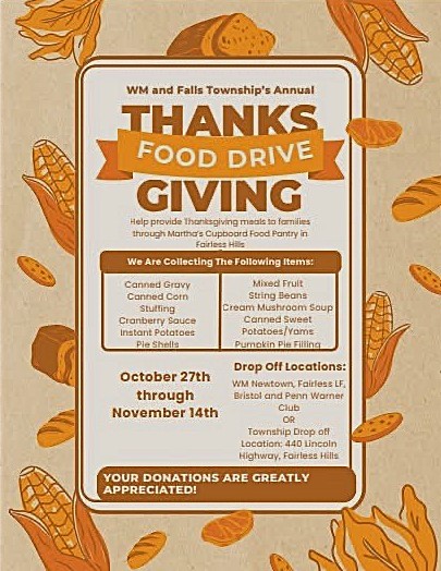 Home Resources News Waste Management & Falls Township's Annual Thanksgiving Food Drive Oct 20, 2025 General News General News Parks & Recreation All Articles Recent Articles Waste Management & Falls Township's Annual Thanksgiving Food Drive 2025 Leaf Collection Schedule Free Bulk Disposal Day - Saturday, October 18, 2025 Resources Calendar Complaint Form Documents, Forms & Permits Feedback Maps News No Solicitation Registry Request for Services Site Map Falls Township 450 Lincoln Highway Fairless Hills, PA 19030 Phone: (215) 949-9000 admin@fallstwp.com View Contacts & Directory