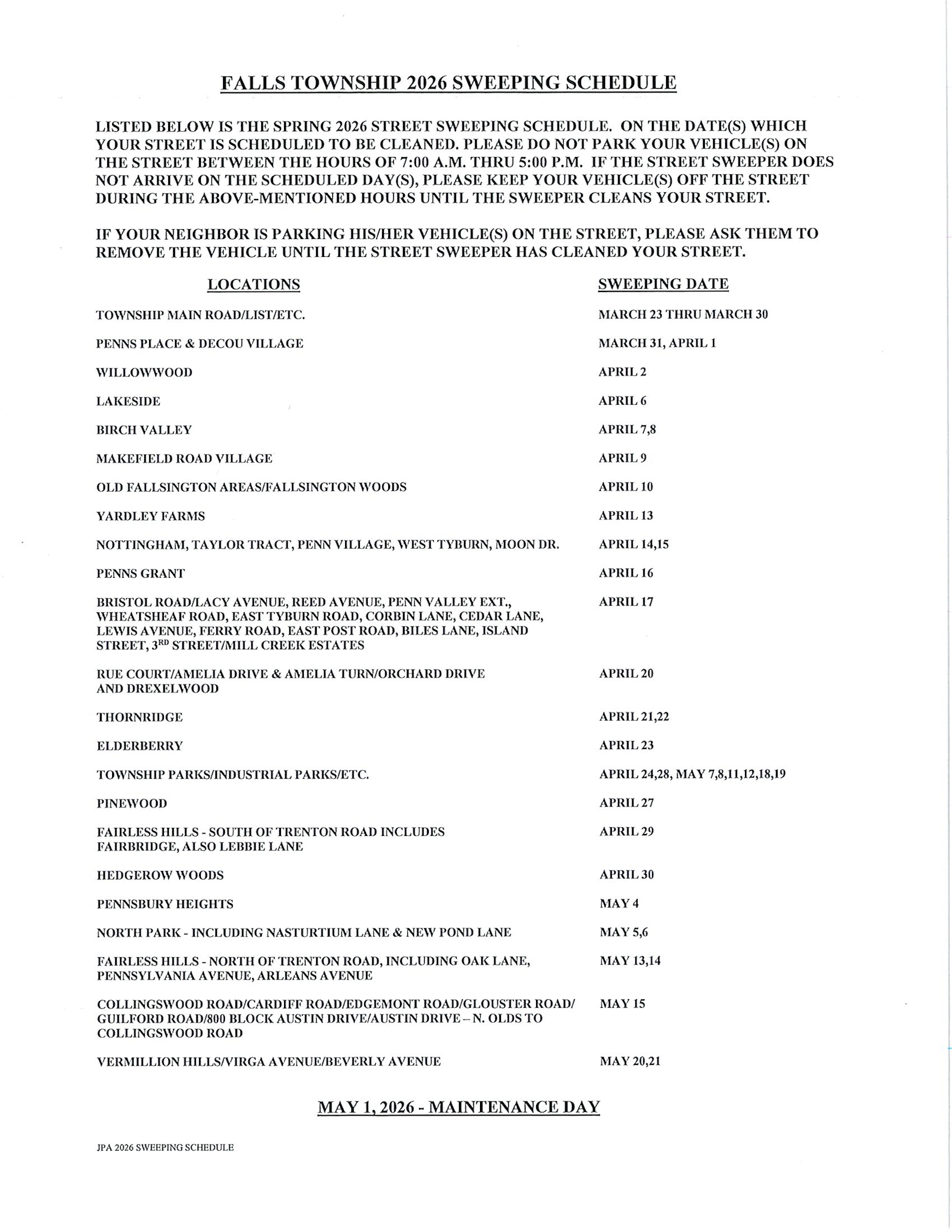 Home Resources News 2026 Street Sweeping Schedule Jan 15, 2026 General News General News Parks & Recreation All Articles Recent Articles 2026 Street Sweeping Schedule Falls Welcomes New Supervisor Falls OKs Minimal Tax Boost for Parks & Rec in 2026 Resources Calendar Complaint Form Permits & Application Forms Feedback Maps News No Solicitation Registry Request for Services Falls Township 188 Lincoln Highway Fairless Hills, PA 19030 Phone: (215) 949-9000 View Contacts & Directory