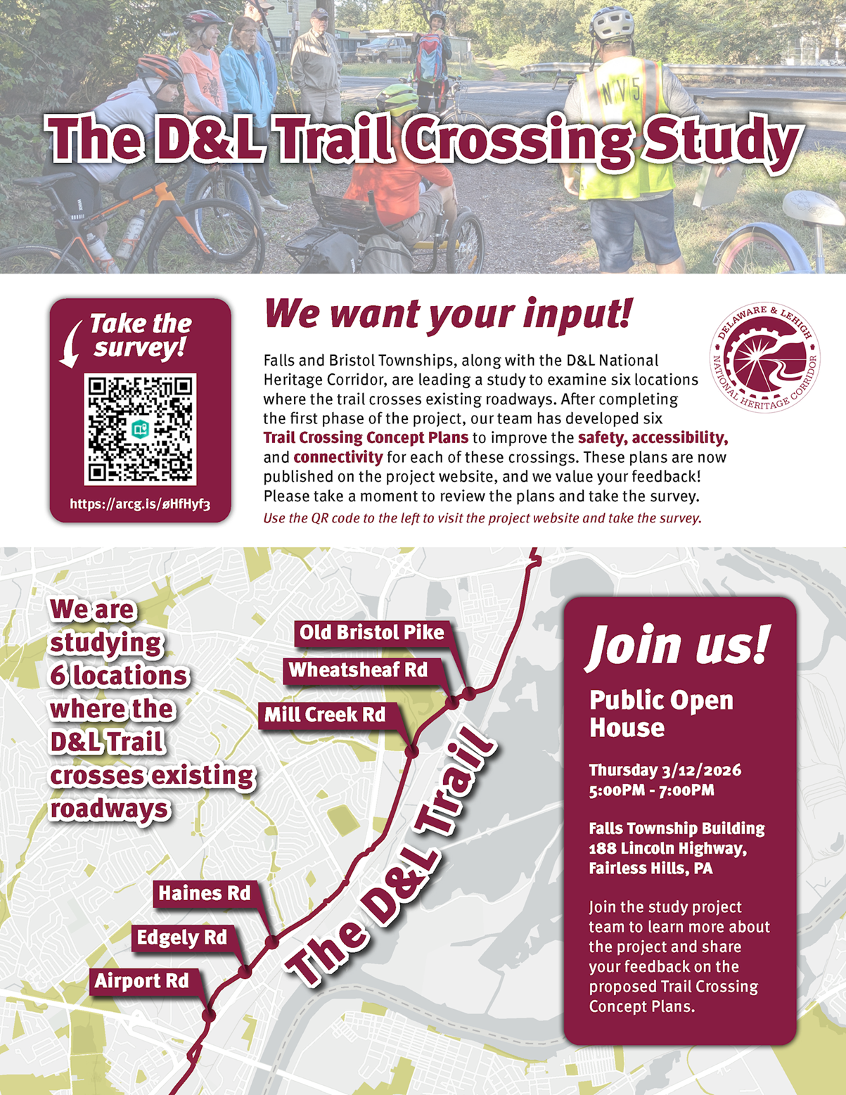 Home Resources News D&L Trail Crossing Study Open House Mar 2, 2026 General News General News Parks & Recreation All Articles Recent Articles D&L Trail Crossing Study Open House Board of Supervisors Meeting Cancelled Township Offices Closed Resources Calendar Complaint Form Permits & Application Forms Feedback Maps News No Solicitation Registry Request for Services Falls Township 188 Lincoln Highway Fairless Hills, PA 19030 Phone: (215) 949-9000 View Contacts & Directory