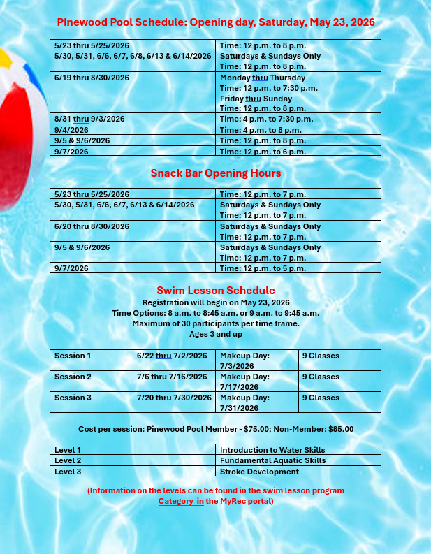 Registrations will be completed using MyRec. You will first create an account, if you do not already have one. Once you create your account, register for the Pinewood Pool membership, swim lessons and various other activities.