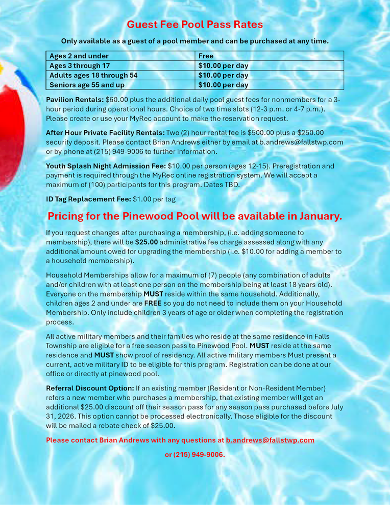 The Pinewood Pool can be reached at 215-949-2960 starting May 23, 2026