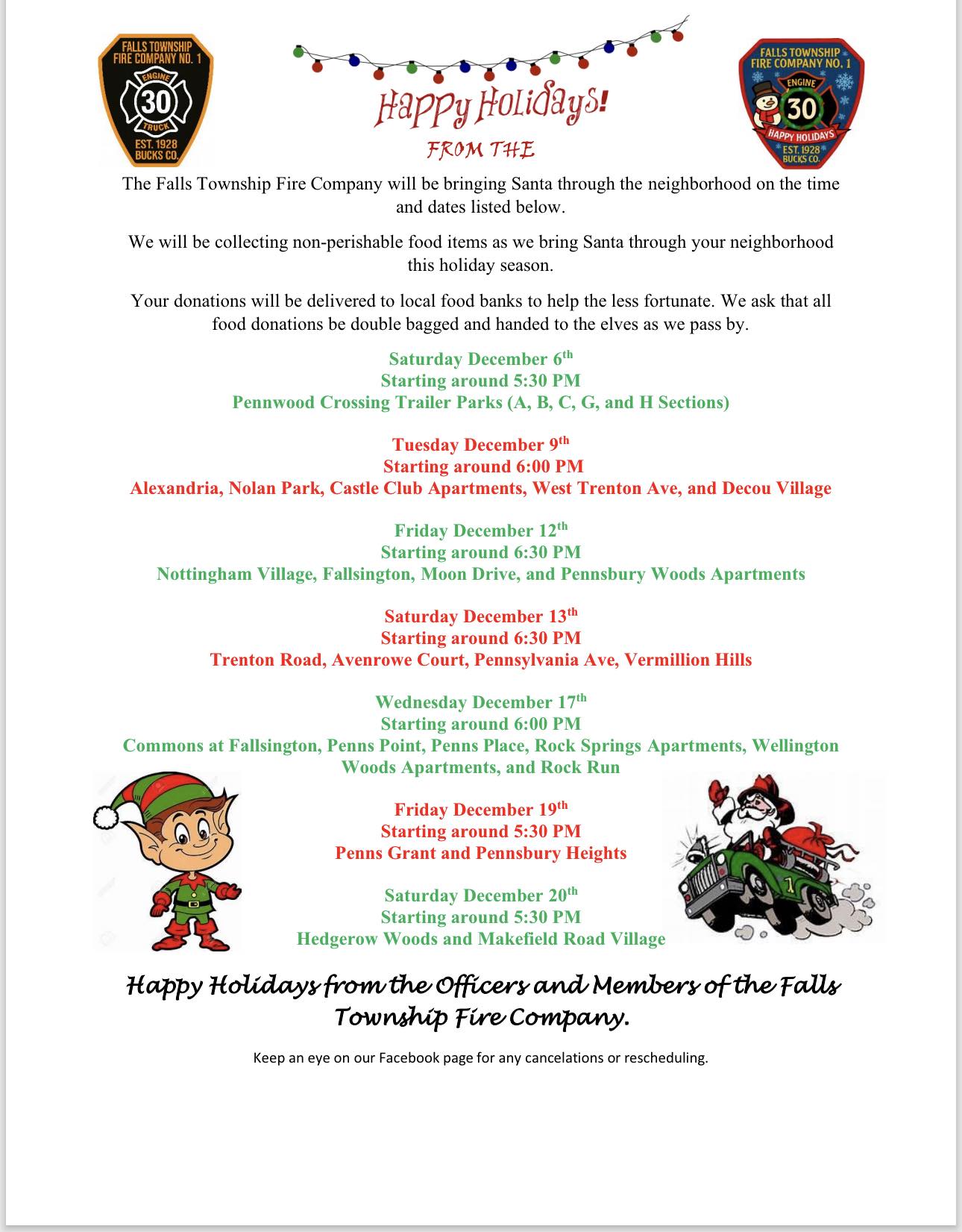 Home Resources News Falls Township Fire Co #1 - Santa's Schedule Nov 24, 2025 General News General News Parks & Recreation All Articles Recent Articles Fairless Hills Fire Department Santa Schedule Falls Considers Minimal Tax Boost for Parks & Rec in 2026 Falls Seeks to Cut Electricity Rate, Restore Martins Creek Resources Calendar Complaint Form Permits & Application Forms Feedback Maps News No Solicitation Registry Request for Services Falls Township 450 Lincoln Highway Fairless Hills, PA 19030 Phone: (215) 949-9000 View Contacts & Directory