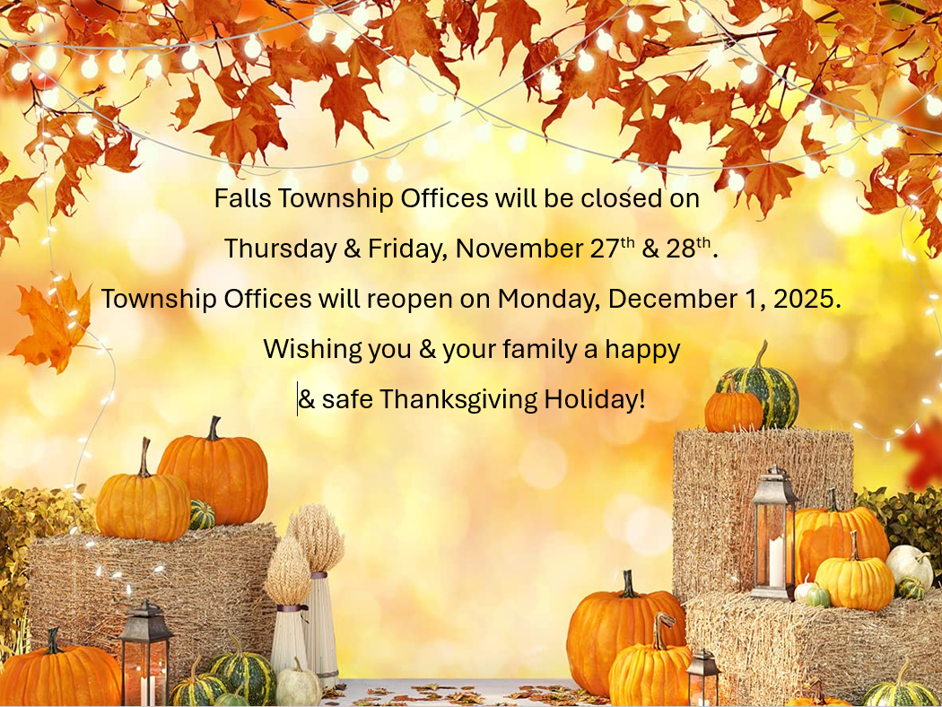 Home Resources News Township Offices Closed in observance of the Thanksgiving Holiday Nov 25, 2025 General News General News Parks & Recreation All Articles Recent Articles Fairless Hills Fire Department Santa Schedule Falls Considers Minimal Tax Boost for Parks & Rec in 2026 Falls Seeks to Cut Electricity Rate, Restore Martins Creek Resources Calendar Complaint Form Permits & Application Forms Feedback Maps News No Solicitation Registry Request for Services Falls Township 450 Lincoln Highway Fairless Hills, PA 19030 Phone: (215) 949-9000 View Contacts & Directory